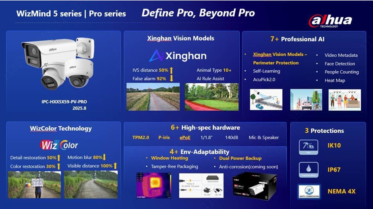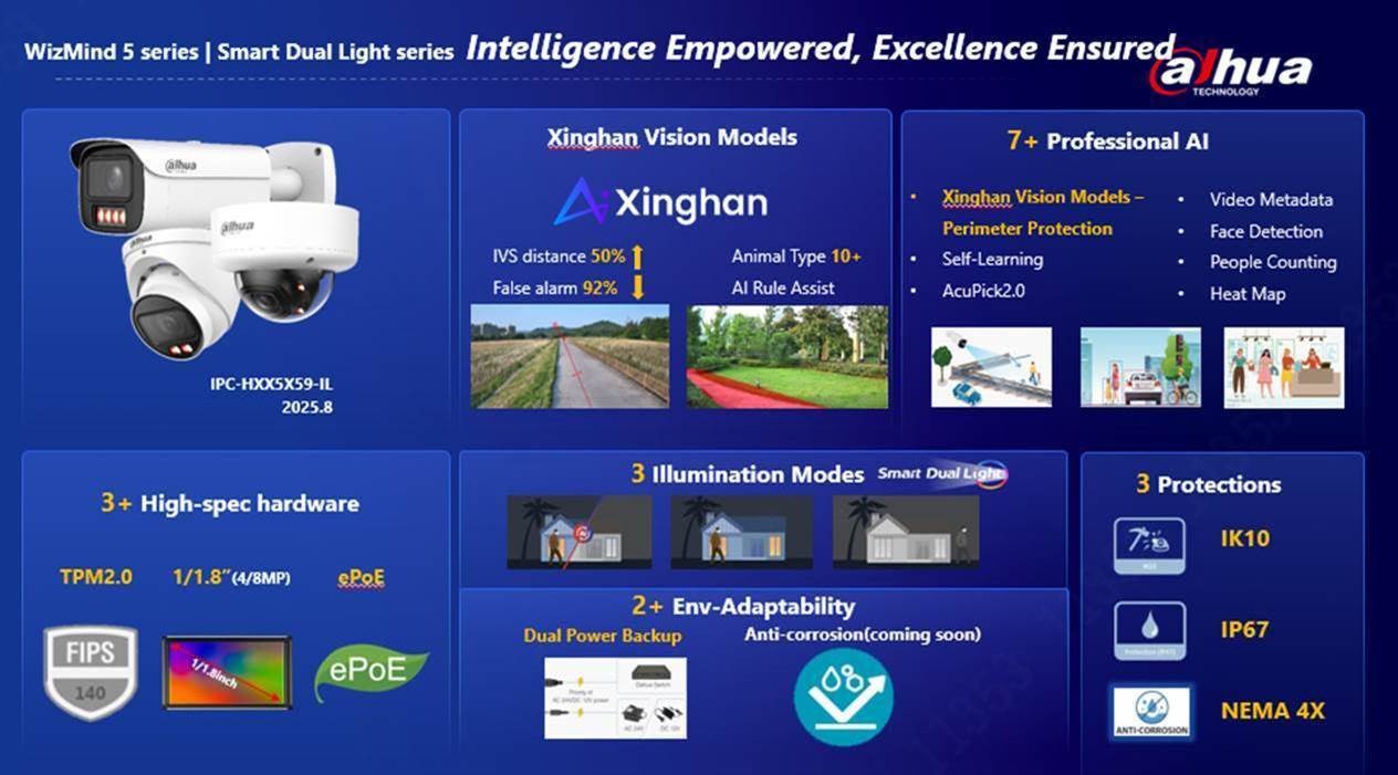 A nova série IPC WizMind 5 adota uma plataforma de última geração, compatível com os Modelos Xinghan Vision, tecnologia WizColor (série 5-Pro), hardware de alta specificação, como TPM 2.0 e aquecimento de janelas, bem como funções profissionais de IA, como AI Rule Assist, AcuPick 2.0 e Perimeter Protection.
